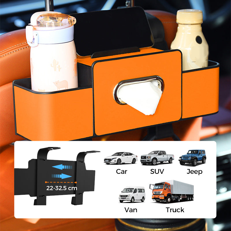 4-IN-1 MULTIFUNCTION DESIGN: Features a dedicated tissue box holder, a phone/tablet stand, a secure cup holder, and bottom utility hooks.